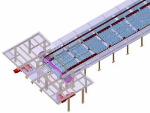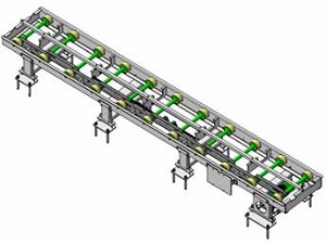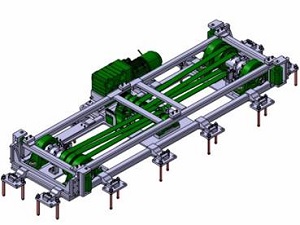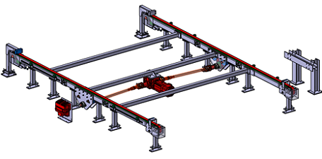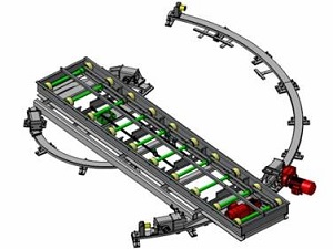 該系統(tǒng)包含的主要輸送機(jī)形式有:滾床、轉(zhuǎn)臺、橫移機(jī)、橫移鏈、升降機(jī)、鏈床、板鏈等等,由于托盤載荷較大,對設(shè)備的承載能力有較高的要求。鏈床主要應(yīng)用于合裝線及相關(guān)托盤儲存線,它運(yùn)行平穩(wěn)、噪音低、可實(shí)現(xiàn)高速運(yùn)行,尤其適用于自動化程度和精度要求高的合裝線。