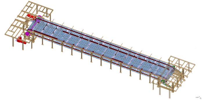 板鏈輸送機由驅(qū)動模鍛、中間模鍛、張緊模鍛、鏈板組件及地坑蓋板等部件構(gòu)成。它通常由雙側(cè)鏈條傳動,每節(jié)鏈條上方固定有鏈板,鏈條下方有行走軌和導(dǎo)向軌道。該設(shè)備以安裝在地坑內(nèi)的形式為主,鏈板上表面與地面平齊。板鏈輸送機具有高承載性、穩(wěn)定性和良好的接近性及物流通過性。