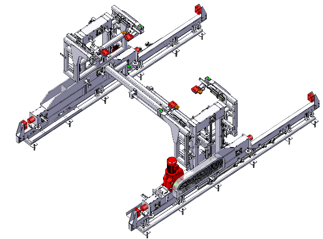 車身下線轉(zhuǎn)載系統(tǒng)通常包括下線升降機、車身轉(zhuǎn)載設(shè)備及一些輔助的定位機構(gòu)和車身吊具打開機構(gòu)等。其中的車身轉(zhuǎn)載設(shè)備是構(gòu)建該系統(tǒng)的核心。它具有兩種輸送設(shè)備間的承接功能,需要滿足較高的節(jié)拍,并根據(jù)需求具有同步輸送功能,可實現(xiàn)X,Y,Z三個方向的動作,對載重也有較高的要求。