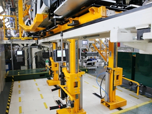 該工廠是神龍汽車的一個標桿工廠,合裝線的自動化程度較高,生產(chǎn)節(jié)拍達到了64JPH。其中合裝工位、分離工位、前后橋擰緊工位、搖籃擰緊工位均為全自動工位。合裝托盤采用全新的輕量化設計,得到了客戶的高度認可。