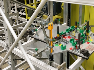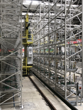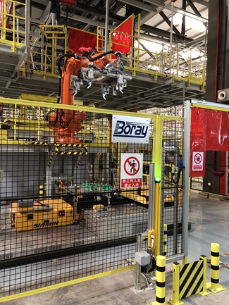 該項目構(gòu)建了分托盤在分裝線 - AGV合裝線 - 分托盤立體庫區(qū) - 分裝線這樣一個封閉的環(huán)線,并由滿載托盤空中自動轉(zhuǎn)載站、空托盤機(jī)器人自動轉(zhuǎn)載站、滾床輸送線、高速堆垛機(jī)、升降機(jī)、分托盤與滑橇的自動拼裝站等轉(zhuǎn)載設(shè)備完成關(guān)鍵的串聯(lián),進(jìn)而保證了整個系統(tǒng)的完善、高效和高度自動化。